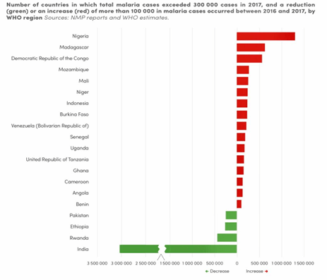 Mapa 1: Países nos quais os casos totais de malária excederam 300.000 em 2017 e que apresentaram uma redução (verde) ou um aumento (vermelho) de mais de 100.000 casos entre 2016 e 2017