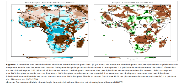FIGURA 1: Anomalies des précipitations absolues en millimètres pour 2021 (à gauche):