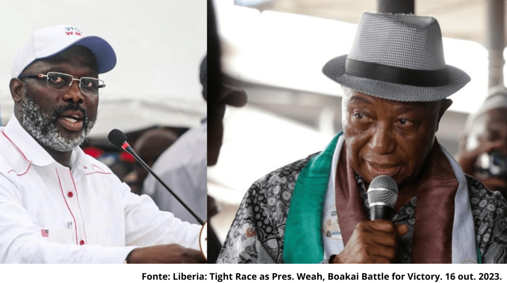 LIBERIAN OBSERVER. Liberia: Tight Race as Pres. Weah, Boakai Battle for Victory. Disponível em: 16 out. 2023. https://www.liberianobserver.com/liberia-tight-race-pres-weah-boakai-battle-victory. Acesso em: 17 out 2023.